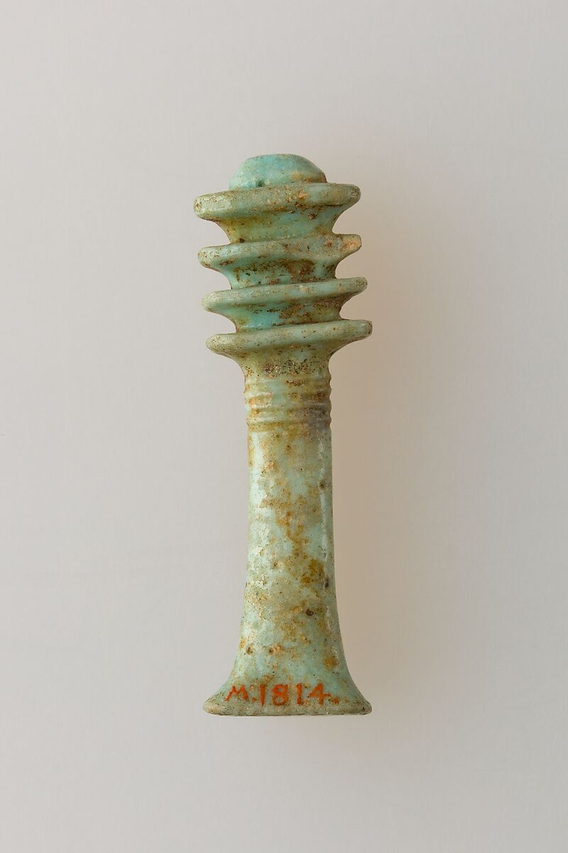Amulets were thought to magically transfer their power to the wearer. Such power often derived from their shape, material, color, and/or the recitations spoken over them. This amulet depicts the so-called djed pillar that ensured permanence. From the New Kingdom on it was also closely connected to Osiris, the god revived after death. Several djed pillar amulets were often placed on the chest of a mummy. Green and blue shades were popular colors for amulets as they alluded to water and vegetation, which in a desert country bore the power of life and regeneration.