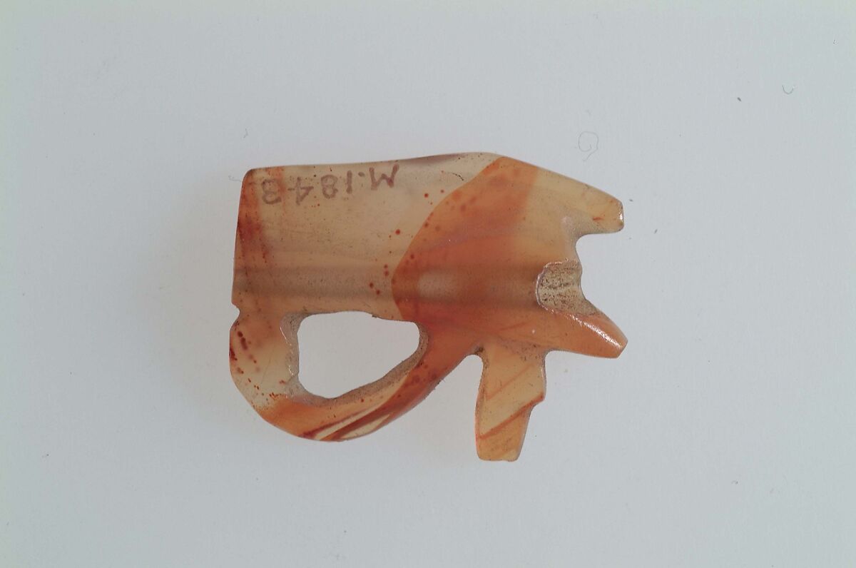 One of the most popular amulets in ancient Egypt, the wedjat eye represents the healed eye of the god Horus. It depicts a combination of a human and a falcon eye, since Horus was often associated with a falcon. Its ancient Egyptian name, wedjat, means "the one that is sound." In Egyptian mythology Horus’ eye was injured or stolen by the god Seth and then restored by Thoth. The wedjat eye embodies healing power and symbolizes rebirth. An amulet in this shape was thought to protect its wearer and to transfer the power of regeneration onto him or her. It was used by the living as well as for the dead.