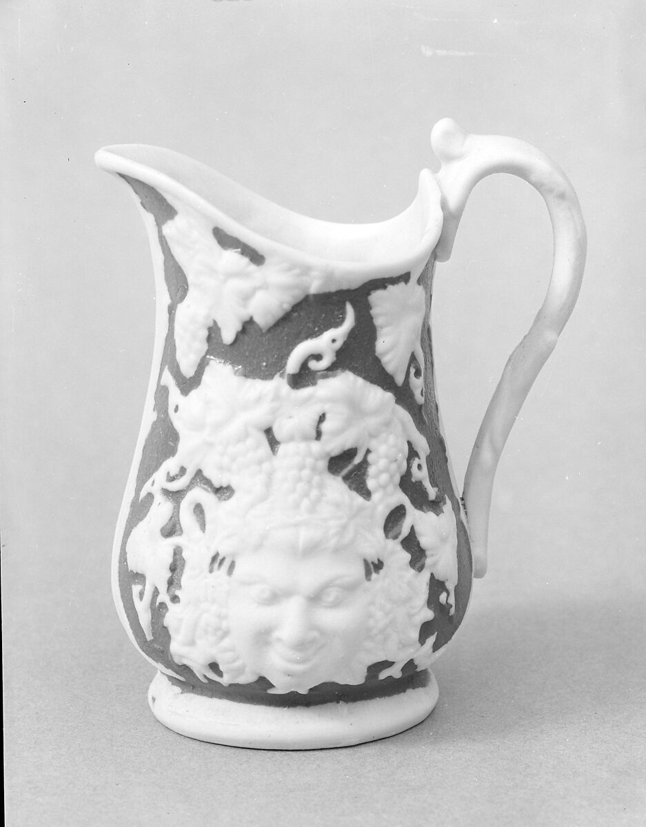 This Parian pitcher came from the same mold as 47.90.79. Both pieces have a white mask of Bacchus and grape decorations set against a brown ground.