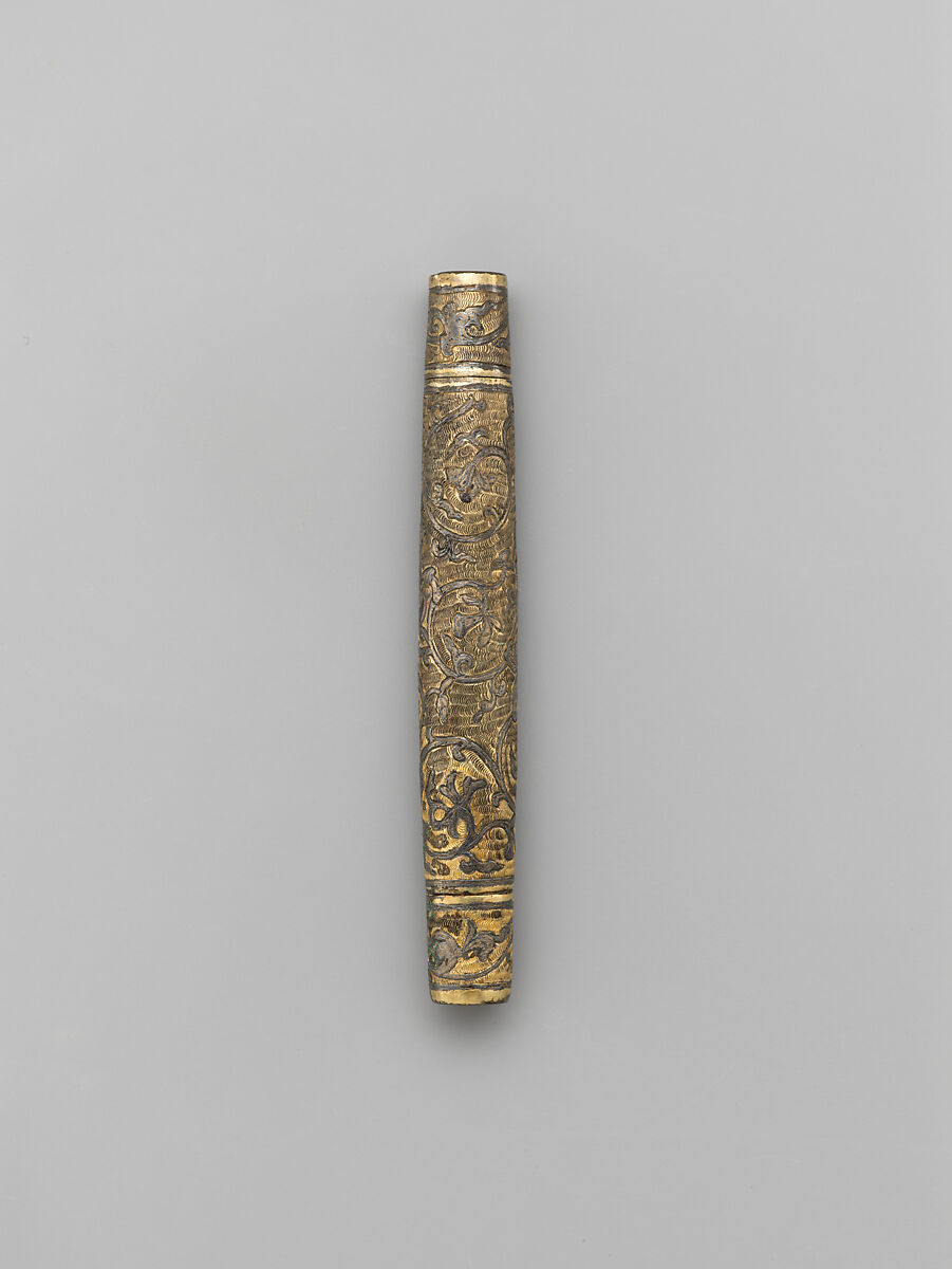 These compact needle cases and bobbins exemplify the relationship between form and function. The hollow inner cylinders provide needle storage, and the segments allow the user to wind different threads onto the same spool. One end of the interior bobbin functions as the top of the outer container. Niello flowers and scrolling as well as densely stamped scallop motifs appear on the open case. Incised arabesques and flora adorn the hidden bobbin.