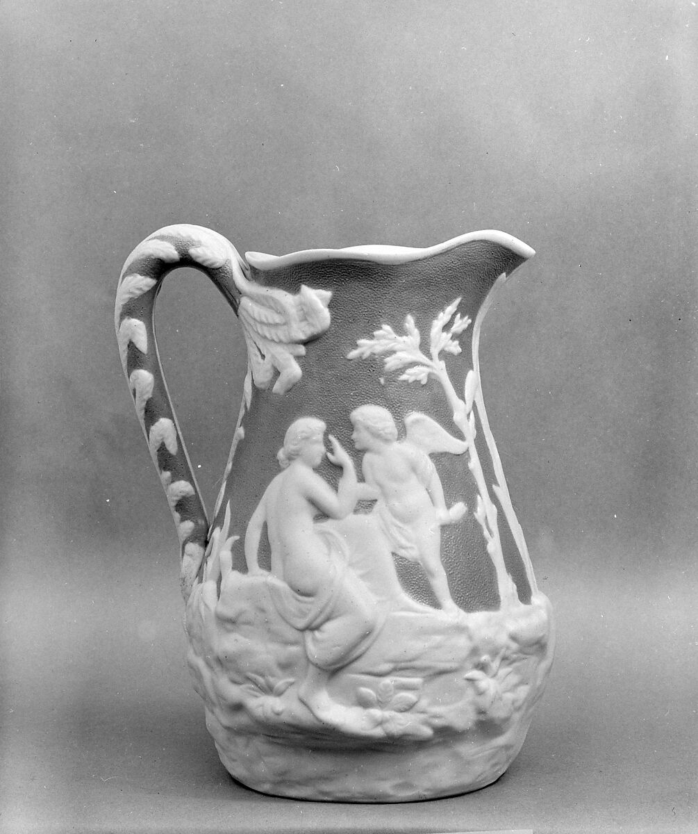 This Parian pitcher with white raised design of Cupid and Psyche came from the same mold as 47.90.188. The same design also appears on a Parian teapot, 47.90.168.