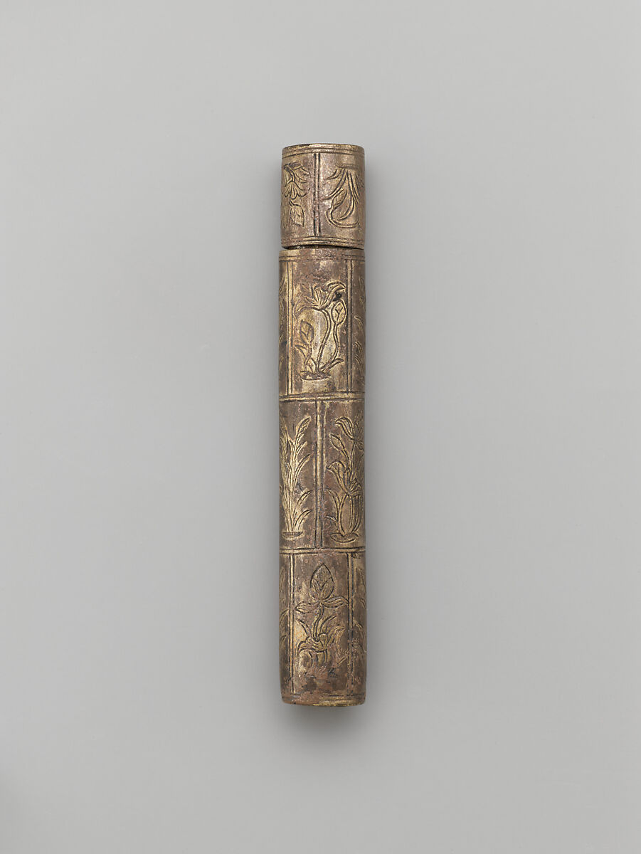 These compact needle cases and bobbins exemplify the relationship between form and function. The hollow inner cylinders provide needle storage, and the segments allow the user to wind different threads onto the same spool. One end of the interior bobbin functions as the top of the outer container. Niello flowers and scrolling as well as densely stamped scallop motifs appear on the open case. Incised arabesques and flora adorn the hidden bobbin.