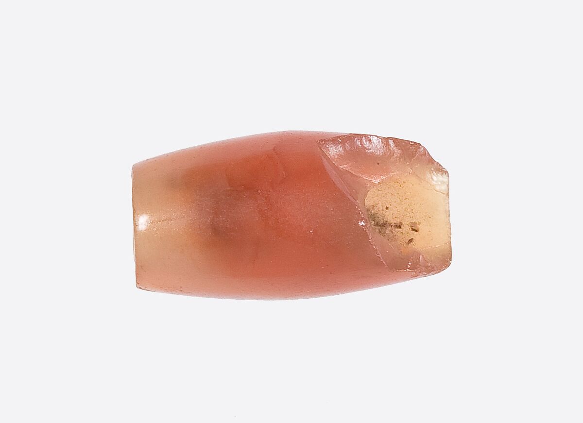 The "sweret" is a barrel-shaped bead of carnelian that was an important part of the mummy trappings from the early Middle Kingdom. It was usually worn at the throat and is seen in this position on early anthropoid coffins (see 11.150.15b). Swerets are also found in burials of the New Kingdom (see 126..8.113)