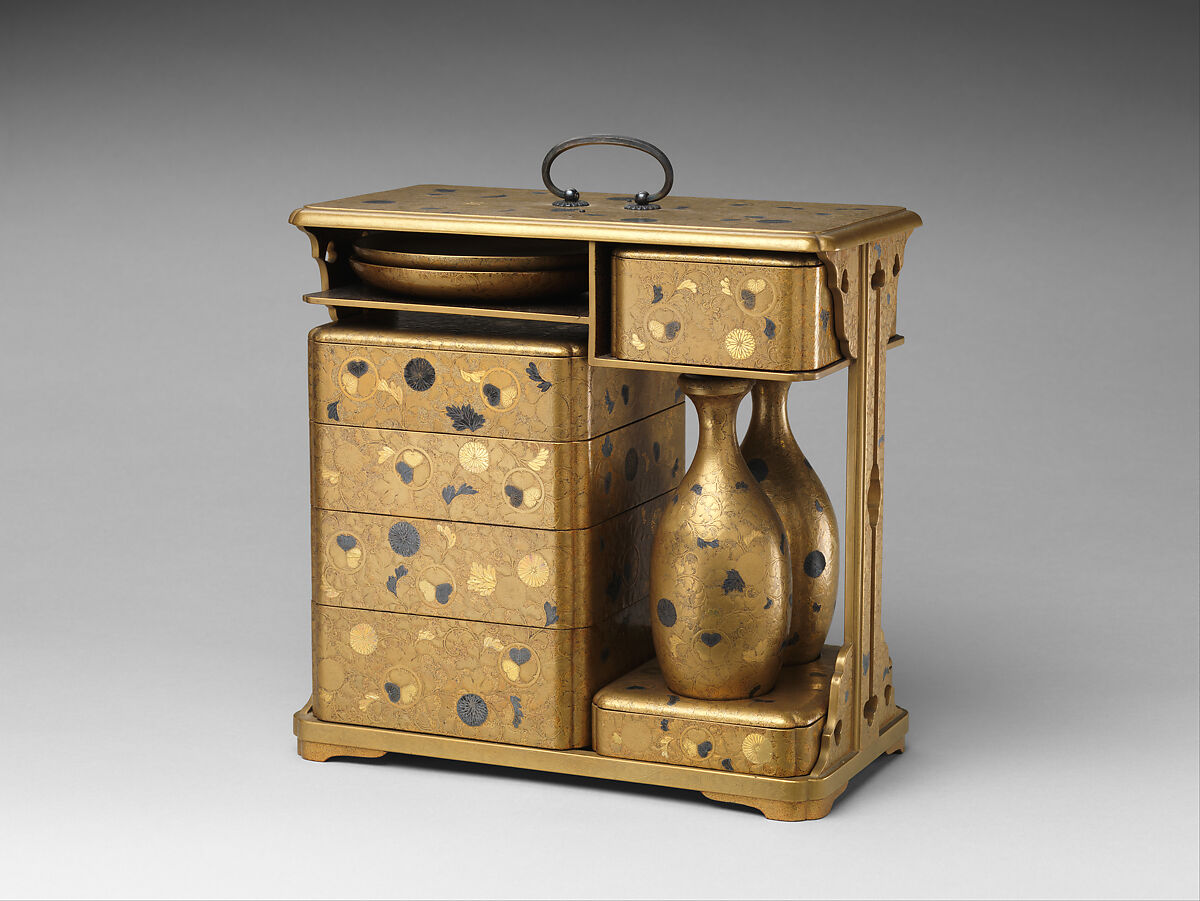 The samurai and daimyo Toyotomi Hideyoshi (1537–1598) established the tradition of grand cherry-blossom viewings, accompanied by large entourages, lavish banquets, tea gatherings, and other festivities. By the Edo period, such outdoor excursions had become popular among elites. They used elegant portable sets with stacked food boxes, sake bottles and cups, and small plates. Over time, the humble bento box, once a simple food container, evolved into a luxurious work of art, exemplified by this richly embellished lacquer example. Bearing the Tokugawa family crest, it was likely used by high-ranking samurai. The tiered boxes would have held an artful array of seasonal delicacies—kasutera tamago (fluffy omelet), wata kamaboko (fish paste), steamed flounder and sea bream, as well as sashimi—accompanied by sweets like karukan (steamed cake).