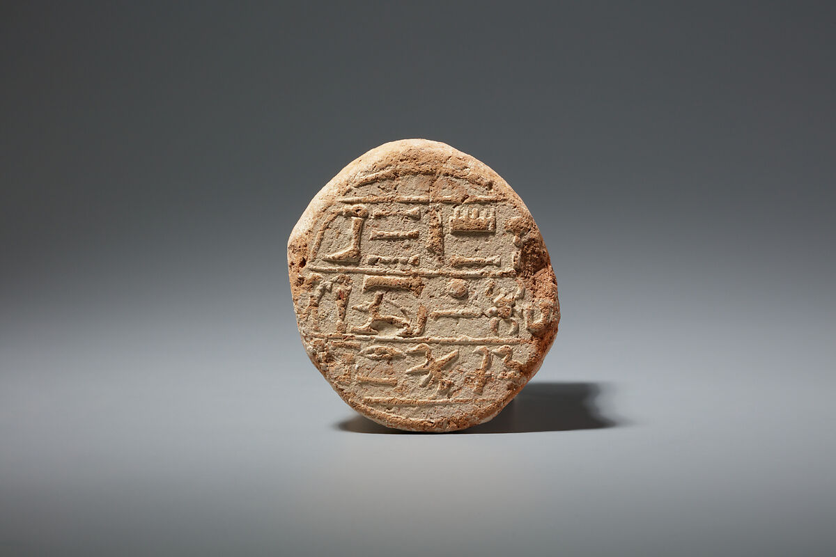 This cone has the impression of a stamp seal inscribed for a wab-priest of the god Amun named Aakheperkareseneb (Aa-kheper-ka-re-seneb). who was also chief of the first phyle and master of secrets. His father's name, Pasanesut (Pa-sa-nesut).