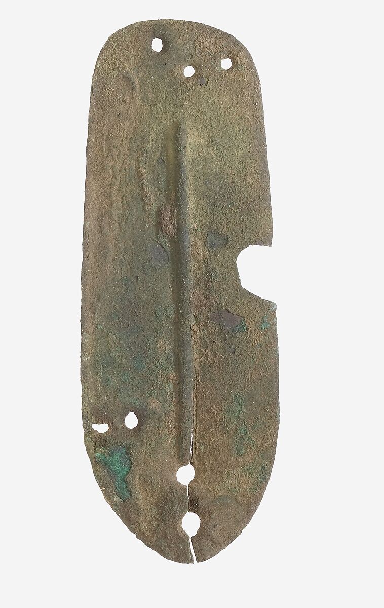 Although bronze and iron scales have been found in Egypt, body armor—a foreign import—was probably not commonly worn there. Two sets of armor appear in a presentation scene in the tomb of Kenamun at Thebes, and a cuirass of leather scales was found in the tomb of Tutankhamun. The ten scales (11.215.452a-j) were excavated from the palace of Amenhotep III, but their position, embedded in an enclosure wall, does not allow us to speculate as to who might have worn them. The scales would have been sewn to a linen or leather backing. Although they vary, they still might have constituted the same armor.