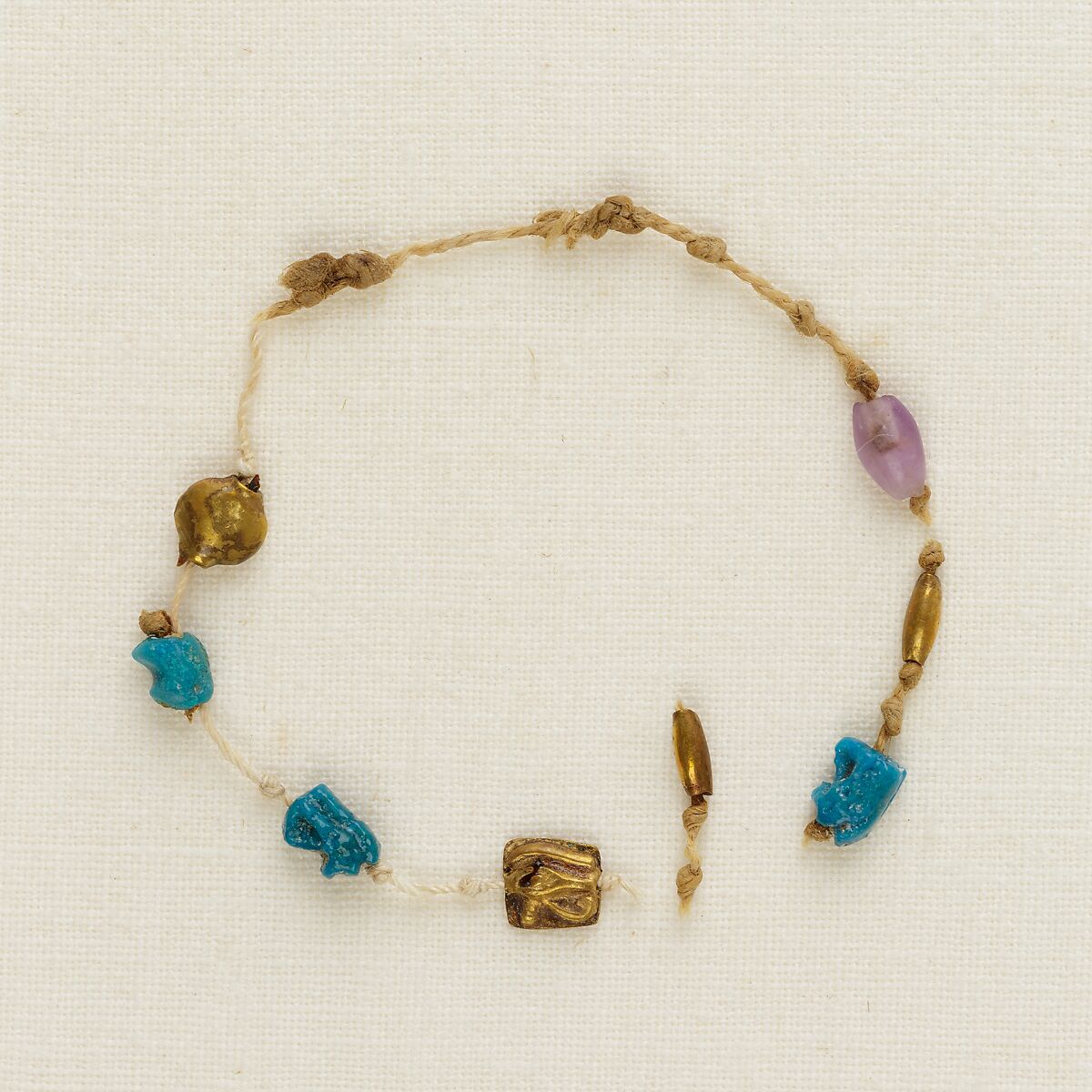 One of five bracelets found around the right wrist of Henettawy’s mummy, this is a single strand of thin cord. Strung at intervals along the strand were four wedjat eye amulets, three of faience and one of gold; one gold and one amethyst barrel bead; and one gold acacia bead. The cord was broken, so the original order of the beads and amulets is uncertain. However, there do appear to be a total of sixteen knots, which would bring the number of elements to twenty-four, echoing the number seen in some of Henettawy’s other jewelry. This in turn may be meant to evoke the daily solar cycle and help ensure her rebirth. The wedjat eyes represent the healed eye of the falcon-god Horus, a powerful symbol of protection and regeneration.
