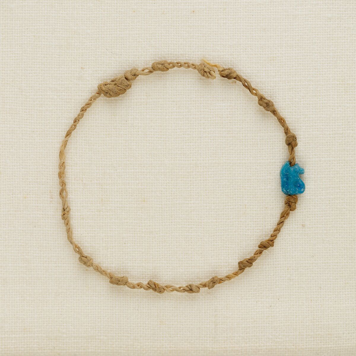 One of four bracelets found around the left wrist of the mummy, this single cord of 2-ply linen was strung with a single wedjat eye amulet of blue faience, with six knots on one side and nine on the other. A representation of the healed eye of the god Horus, the amulet would have served magically to protect Henettawy and help ensure her eternal regeneration.
