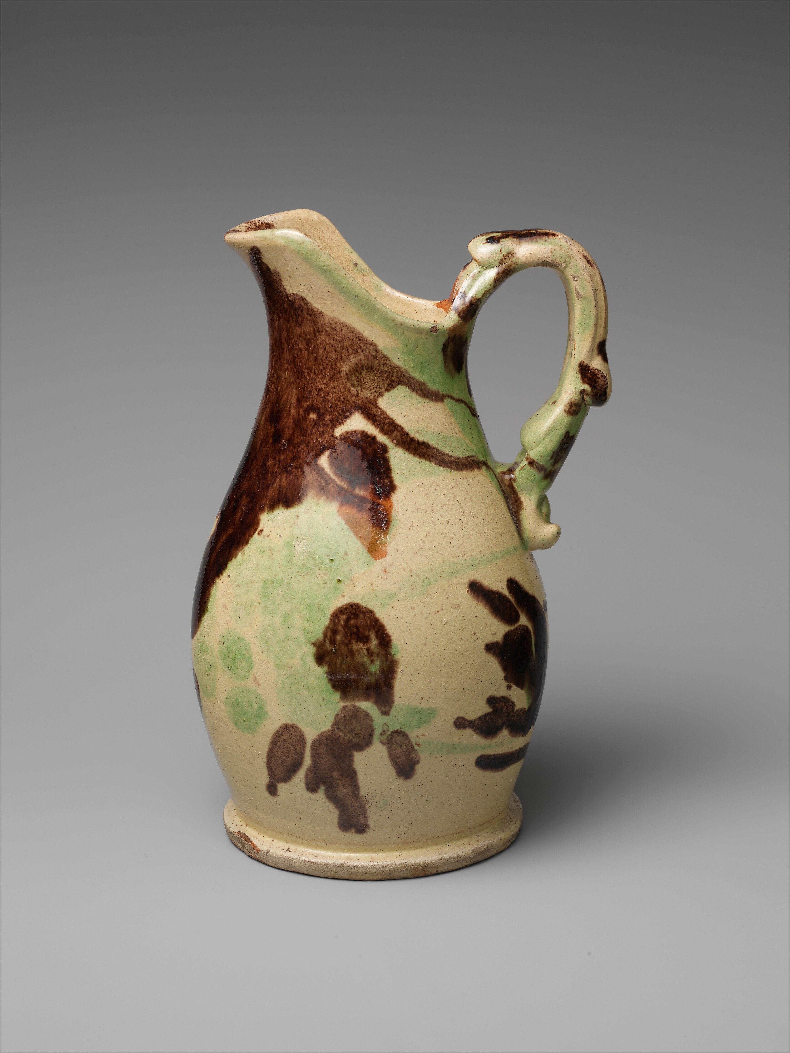 The Eberlys glazed much of their “fancy” ware with the mottled brown-and-green glaze characteristic of late-nineteenth century Shenandoah Valley pottery. The scrolled ornament over the soap dish and the trompe-l’oeil screws that appear to secure the handles further enliven this utilitarian set.