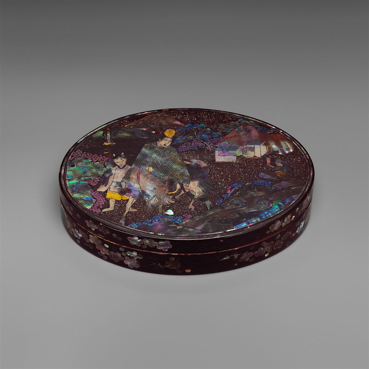 - Medium: Black lacquer over copper, inlaid with mother-of-pearl
