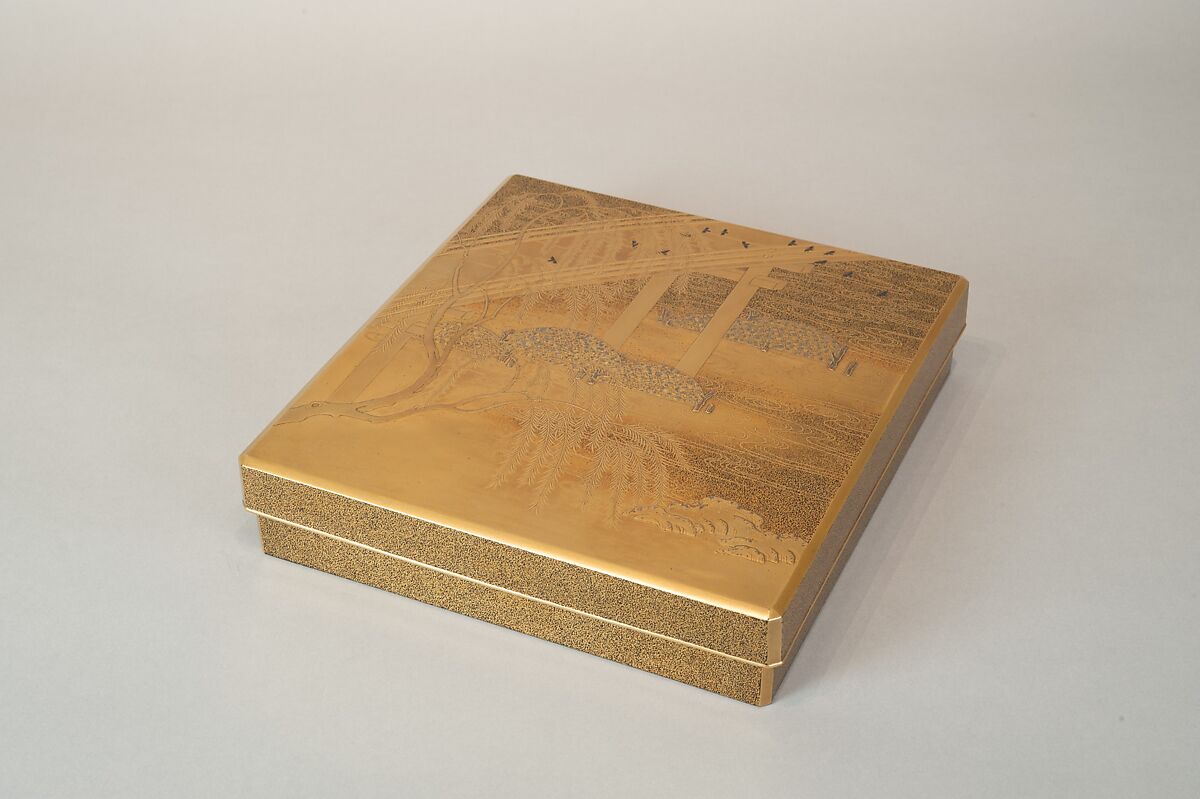 - Medium: Wood, lacquer sprinkled with gold, black lacquer, and shell inlay