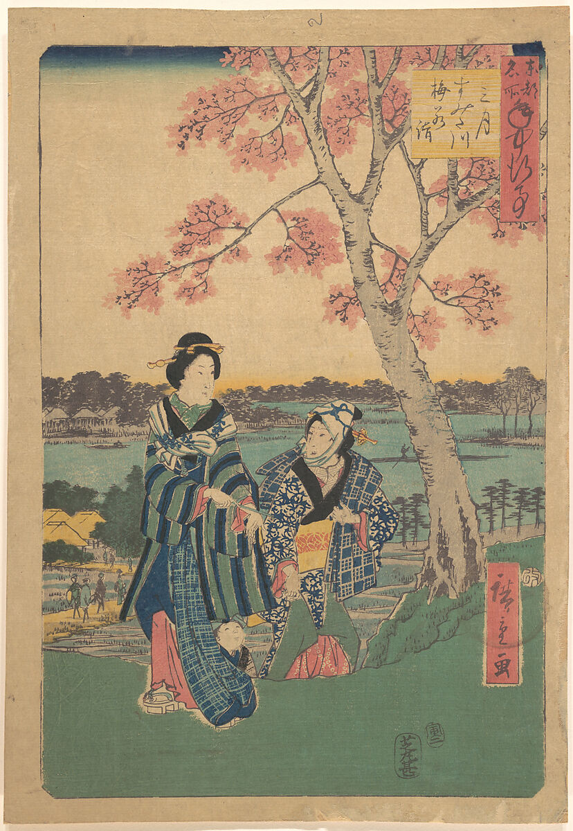 - Title: Plum-blossom viewing in the third month at Sumida River from the series Annual Events at Famous Places in the Eastern Capital (Tōto meisho nenjū gyōji sangatsu sumitagawa waka mōde)
