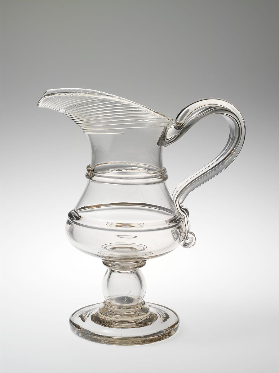 The threaded decoration on the lip and the tooled midrib of this classic Empire pitcher are characteristic features of the New England Glass Company’s products. The hollow stem contains an English shilling dated 1817.
