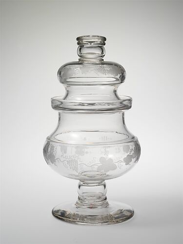 The chainlike decoration on this pitcher and sugar bowl (69.167a,b) was achieved by applying two parallel threads of glass and then nipping them together to form the connected ovals. This mode of decoration dates back to ancient Roman times and was revived on sixteenth-century Venetian and late-seventeenth-century English glass. It appeared again on English glass in the second half of the eighteenth century. Thomas Cains, who came from Bristol, England, was the proprietor of both firms that may have produced these pieces.