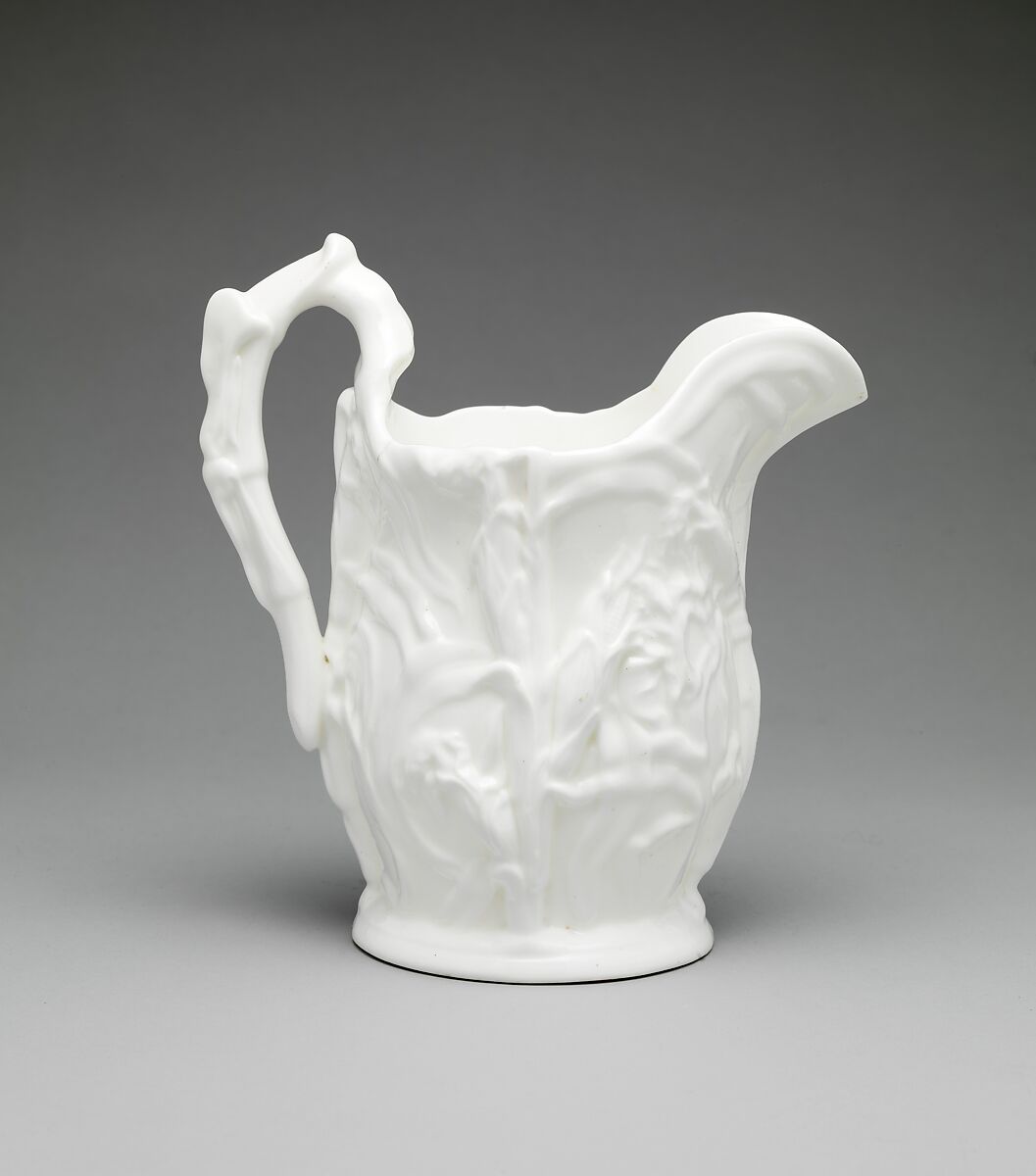 Rococo-style corn stalks adorn this maize pitcher, a typical example of the wares produced at Charles Cartlidge's New York Factory. Josiah Jones, one of Cartlidge's modelers, may have made this piece with molds he took from New York to his new factory in South Carolina. Another pitcher of almost identical design is 20.109.2.