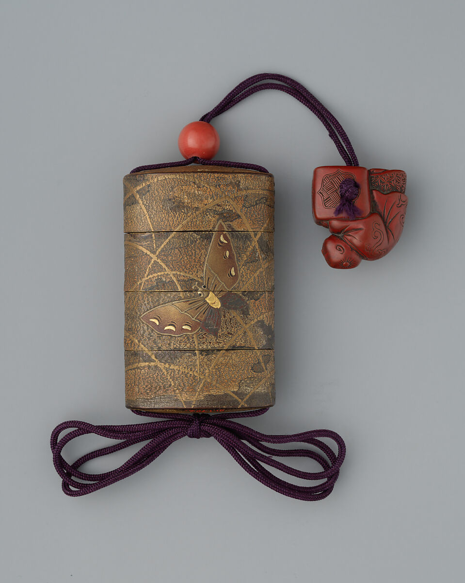 - Medium: Inrō: three cases; lacquered wood with cherry bark, gold and silver hiramaki-e, gold and silver foil application; ojime: semiprecious stone bead; netsuke: Chinese boy (karako) with covered brazier; carved wood with red lacquer