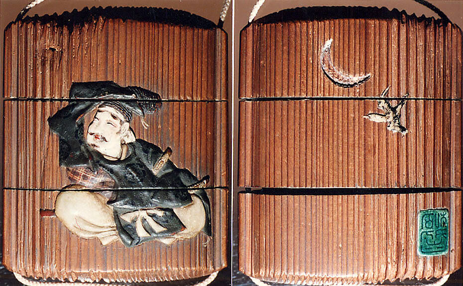 - Title: Case (Inrō) with Design of Samurai Seated on Ground (obverse); Bird Flying before a Crescent Moon (reverse)