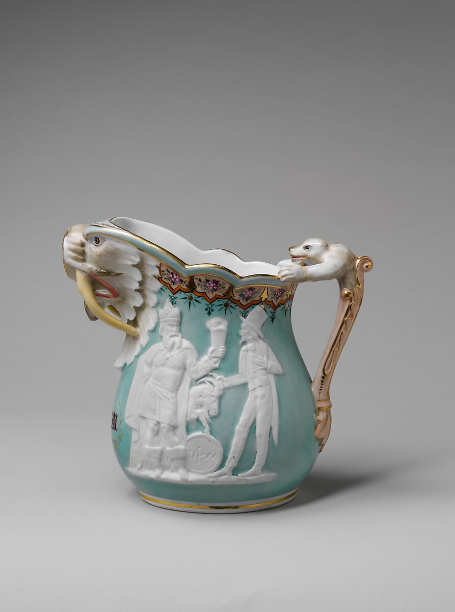 On the other side of the pitcher, Muller departs from the Harte poem by depicting the character of King Gambrinus, the mythical Flemish inventor of beer, offering Brother Jonathan, the American "everyman" (and predecessor of Uncle Sam), a glass of foaming brew. The scene references a short story published in 1868 by the Frenchman Charles Deulin (1827-1877).