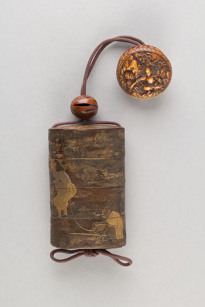 - Title: Case (Inrō) with Design of Monkey Trainer and Seated Monkey on Leash (obverse); Bundle, Hat, Sticks and Staff (reverse)