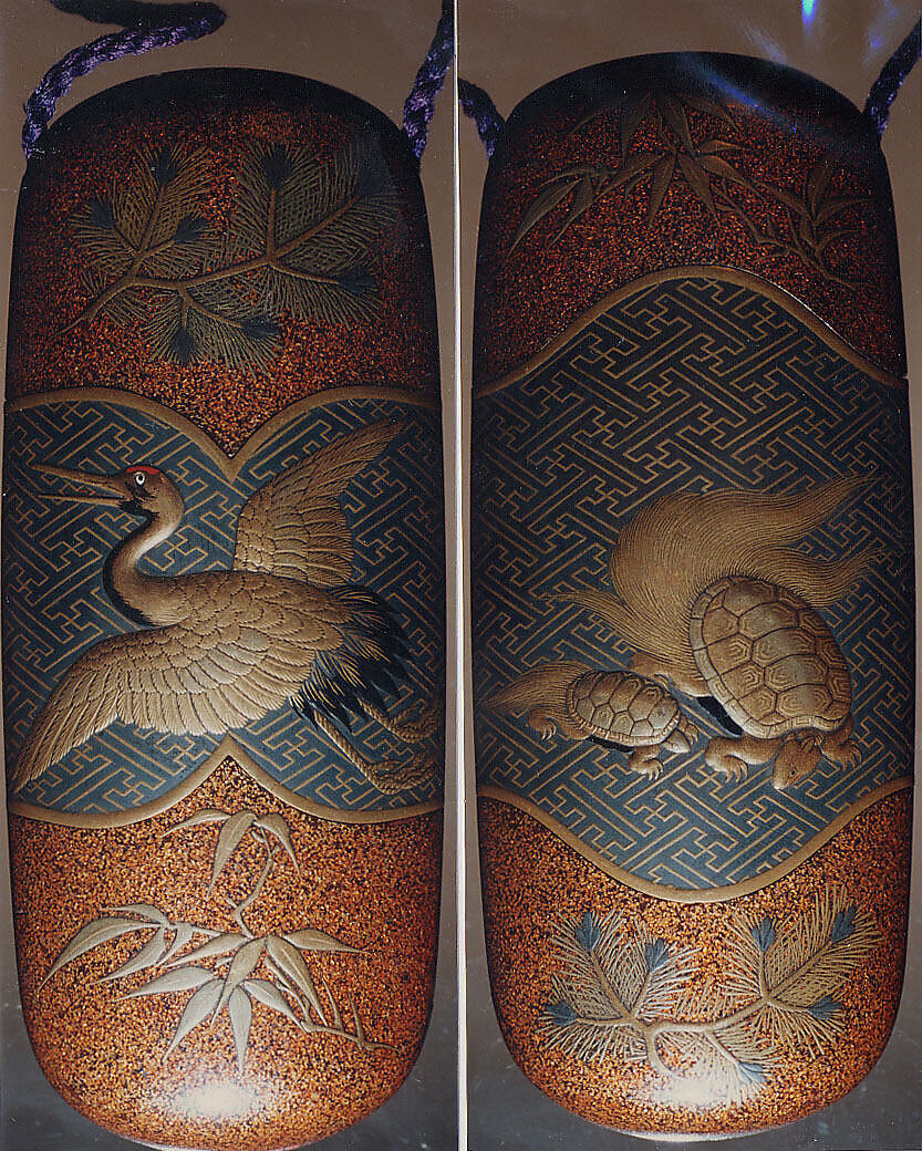 Case (Inrō) with Design of Long-Haired Turtles (obverse); Stork with Pine Sprigs (reverse)