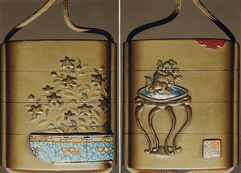 - Title: Case (Inrō) with Design of Lion on a Stand Looking at a Butterfly (obverse); Chinese Bellflowers in a Pot (reverse)