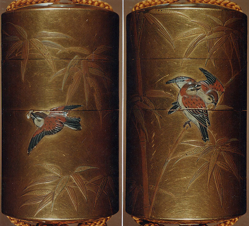 - Medium: Two cases; lacquered wood with gold and silver hiramaki-e, togidashimaki-e, gold foil cutouts, and colored ivory inlay on gold lacquer ground Netsuke: kagamibuta type, bamboo with sparrow; wood and metal Ojime: blue-and-white porcelain bead