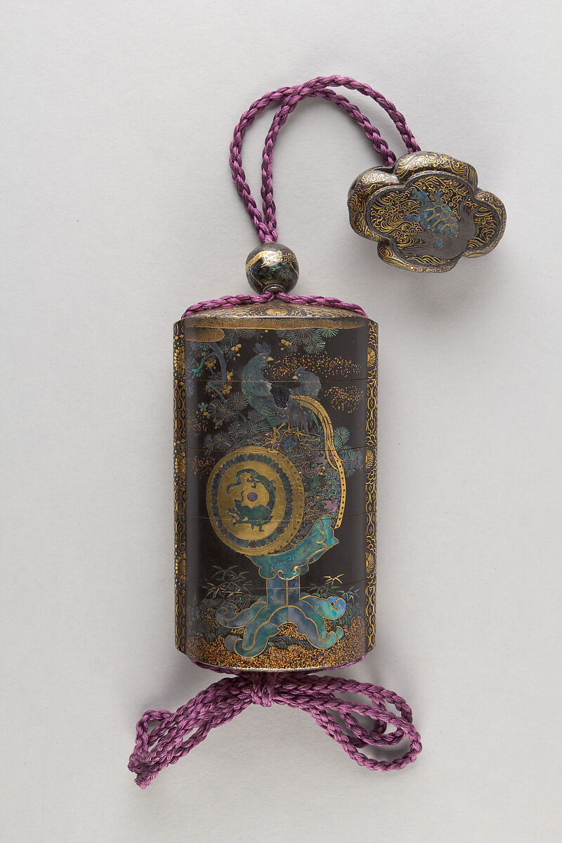 - Title: Case (Inrō) with Design of Pine and Cherry Tree (obverse); Rooster and Hen on a Drum (reverse)