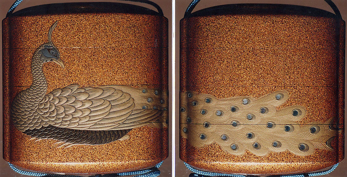 - Medium: Nashiji ground with gold and silver takamaki-e, hiramaki-e, and mother-of-pearl inlayNetsuke: hunter struggling with bear; carved ivoryOjime: carnelian bead