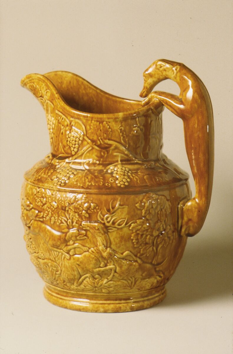 The handle of this pitcher is in the form of a hound, to compliment the hound-and-hunt scene on the body which was a standard motif derived from English prototypes. This pitcher is covered in a mottled brown and cream "Rockingham" glaze.