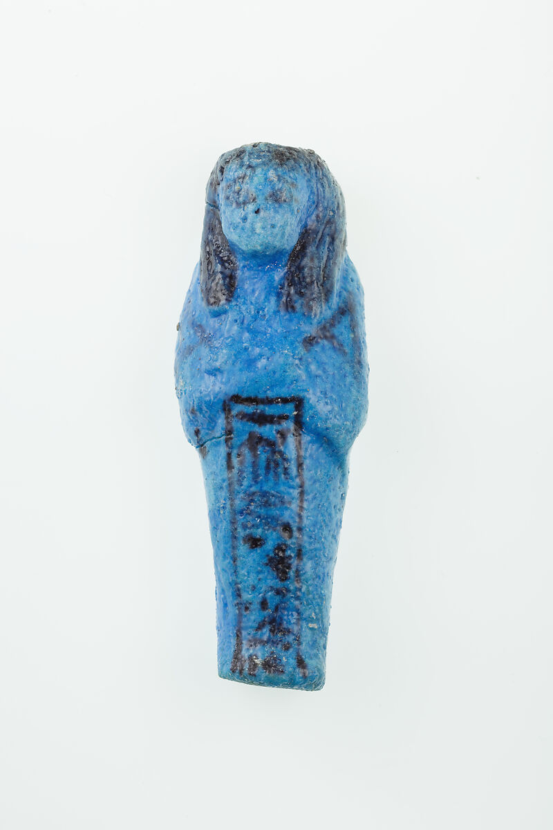 Almost 400 small funerary figures known as shabtis were found with Nauny’s burial. These can be seen as avatars, meant to carry out agricultural labor on Nauny’s behalf in the afterlife. Of the 393 shabtis discovered, 355 were workers like this one, and 37 were overseers (see for example <a href="https://www.metmuseum.org/art/collection/search/551114">30.3.28.3</a>). Based on other assemblages from this era, Nauny originally might have had a total of 365 workers, one for each day of the year. This mummiform figure holds a hoe in each hand and has a basket on its back. The inscription on the front of the body calls Nauny a King’s Daughter, and an “illuminated Osiris.” This indicated that she had been transformed through the process of mummification and identified with the principal god of the dead, then reanimated by the light of the sun god as he traveled through the Netherworld each night. Nauny’s shabtis were divided between seven boxes. Five of these, with their shabtis, were given to The Met, while two were sent to the Egyptian Museum in Cairo.