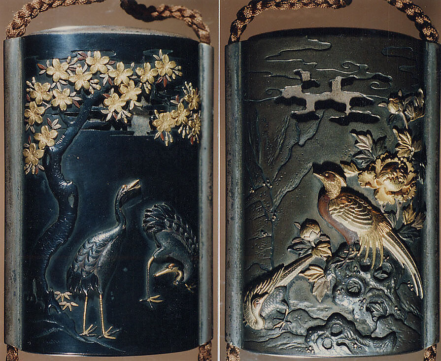 - Title: Case (Inrō) with Design of Two Cranes beneath a Flowering Cherry (obverse); Pheasant beside a Peony (reverse)