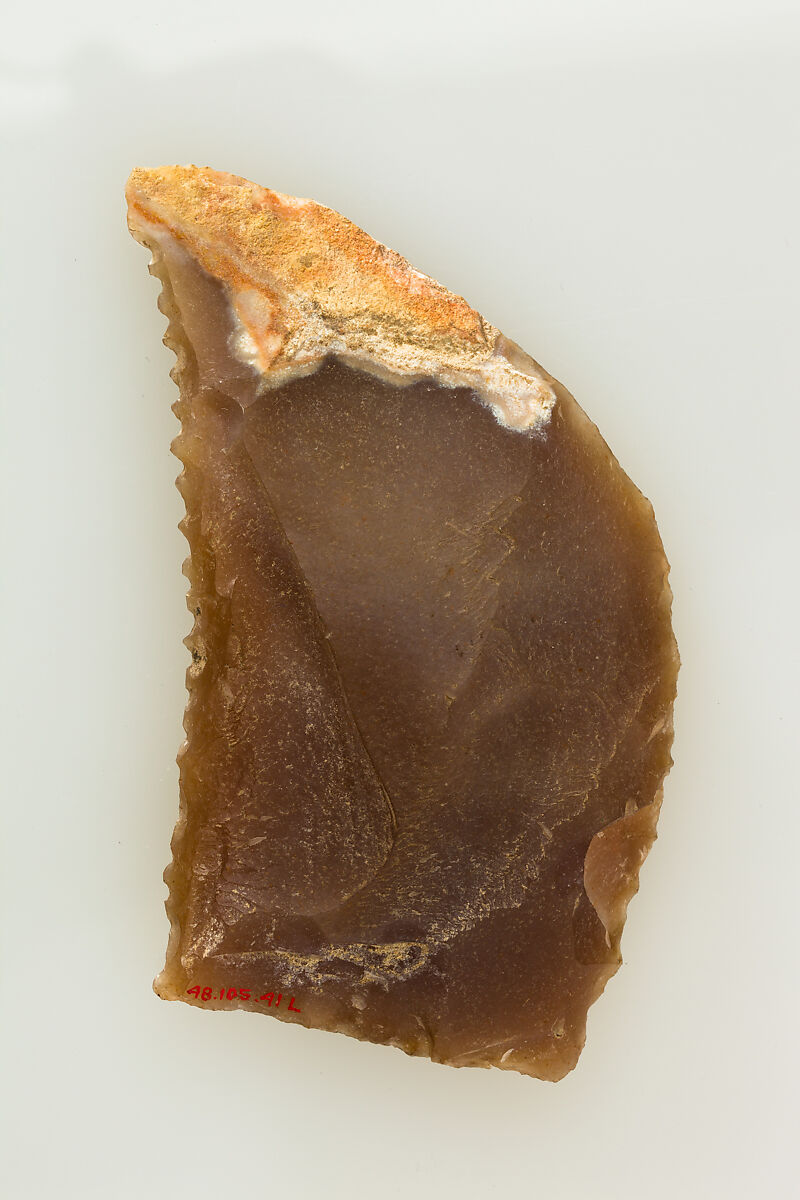 This small piece of flint was a key element to a successful agricultural season in ancient Egypt. Grain was a staple of the economy, as bread and beer made from grain were consumed daily. They also formed the foundation of eternal sustenance, as funerary offerings. Ancient Egyptians used sickles made from flint and wood to reap grain. Pieces of flint such as this one were shaped to fit into a wooden haft along with a number of other such inserts, and secured with an adhesive. The flint pieces provided a sharp edge to cut the grain stalks. With use, the flint would wear down and develop a shiny gloss. The flint inserts could be re-sharpened or replaced as needed.
