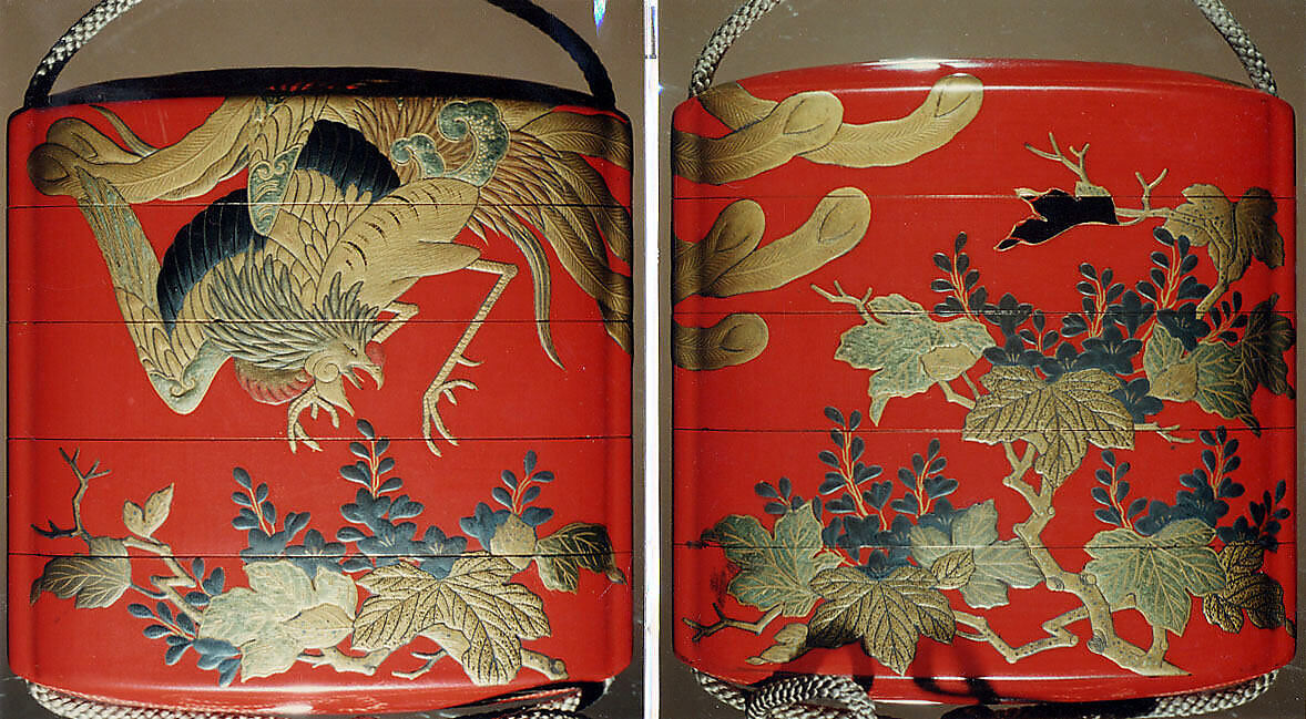 - Medium: Lacquer, red ground, gold, black and silver hiramakie, takamakie; Interior: nashiji and fundame