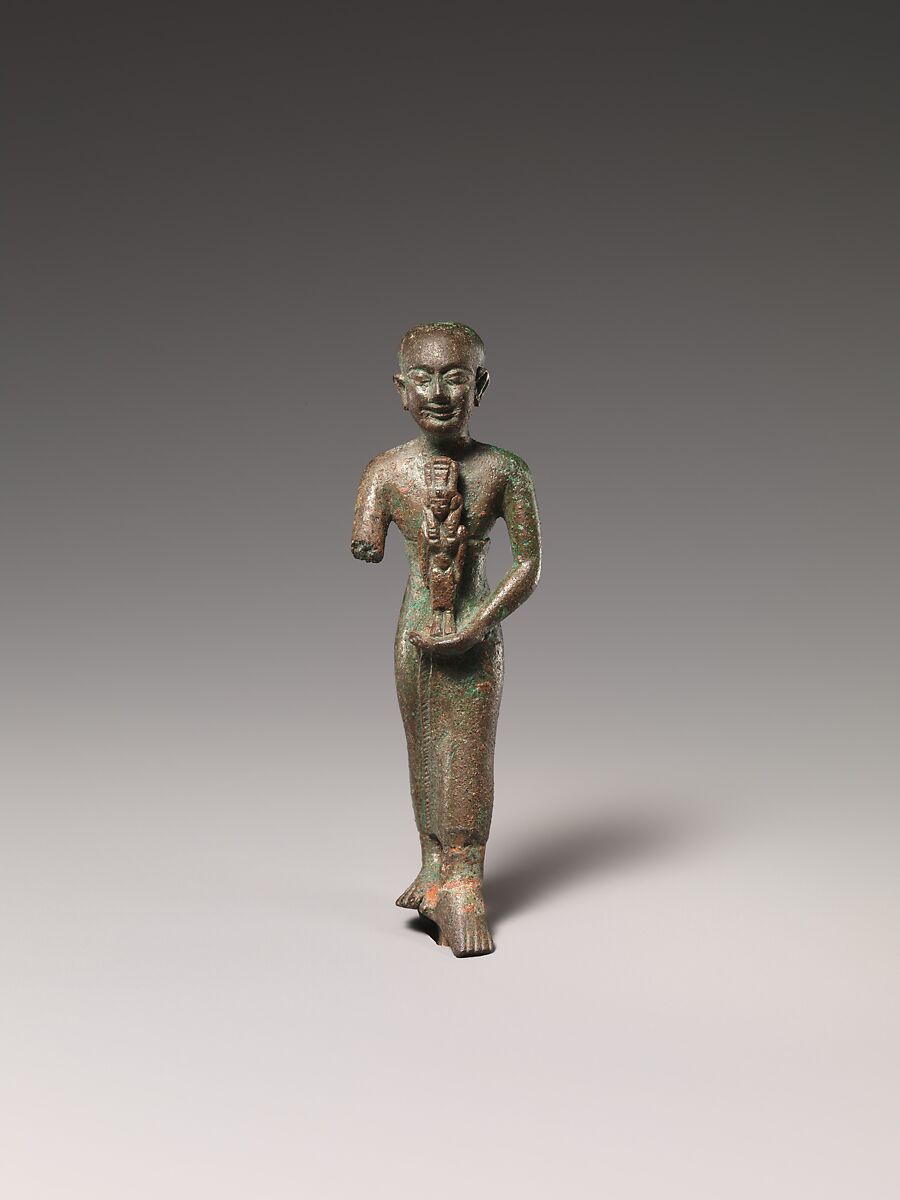 This small figure depicts a man in a wrapped fringed garment, and whose shaven skull could indicate he is a priest. He carries a figure of a goddess. The goddess's headdress is the sound box of a sistrum indicating she is either Nebethetepet - an aspect of Hathor - or the goddess Nehemetaway, the spouse of Thoth.