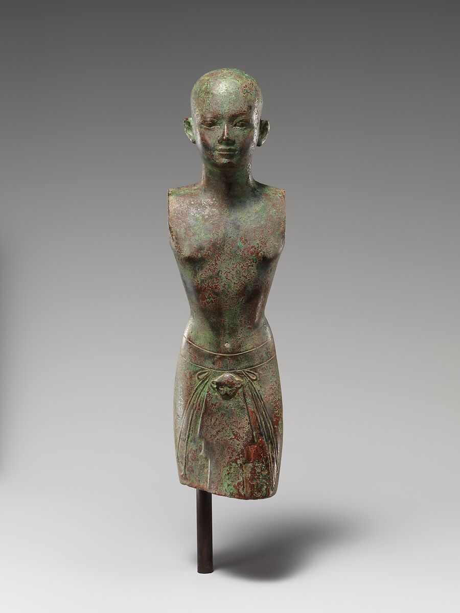 The shape of the head with small features atop a slender but powerful body conforms to representational conventions associated with Kushites. Beneath the bare torso, the lower body is clothed with a kilt. From a wide belt hangs an apron topped with a leopard's head, a garment associated with royalty although a similar garment is adopted by priests. Long cords ending in floral tassels favored by Kushite kings and priests also hang from the belt. The arms and legs, now missing, would have been attached separately.