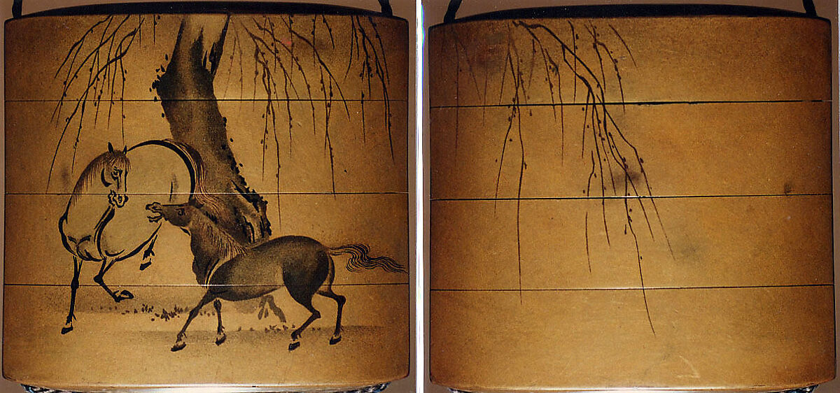 Case (Inrō) with Design of Two Horses beneath Leafless Weeping Willow Tree