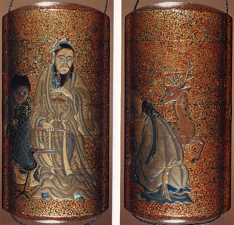 Case (Inrō) with Design of Jurōjin (God of Longevity) Seated beside Stag (obverse); Sage with Crane and Fly Whisk (reverse)