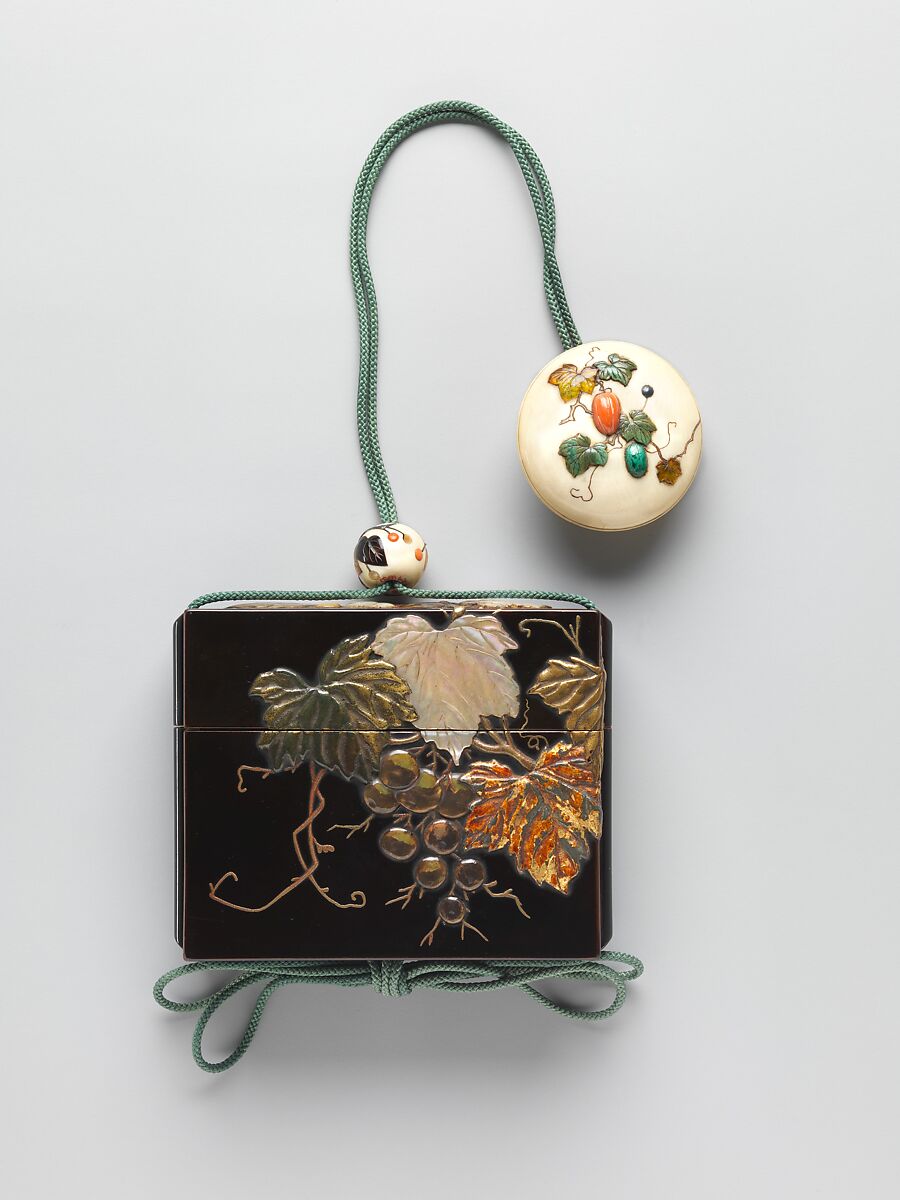 - Medium: One case; lacquered wood with gold hiramaki-e, gold foil application with green stained ivory, mother-of-pearl, amber, and horn inlays on black lacquer ground