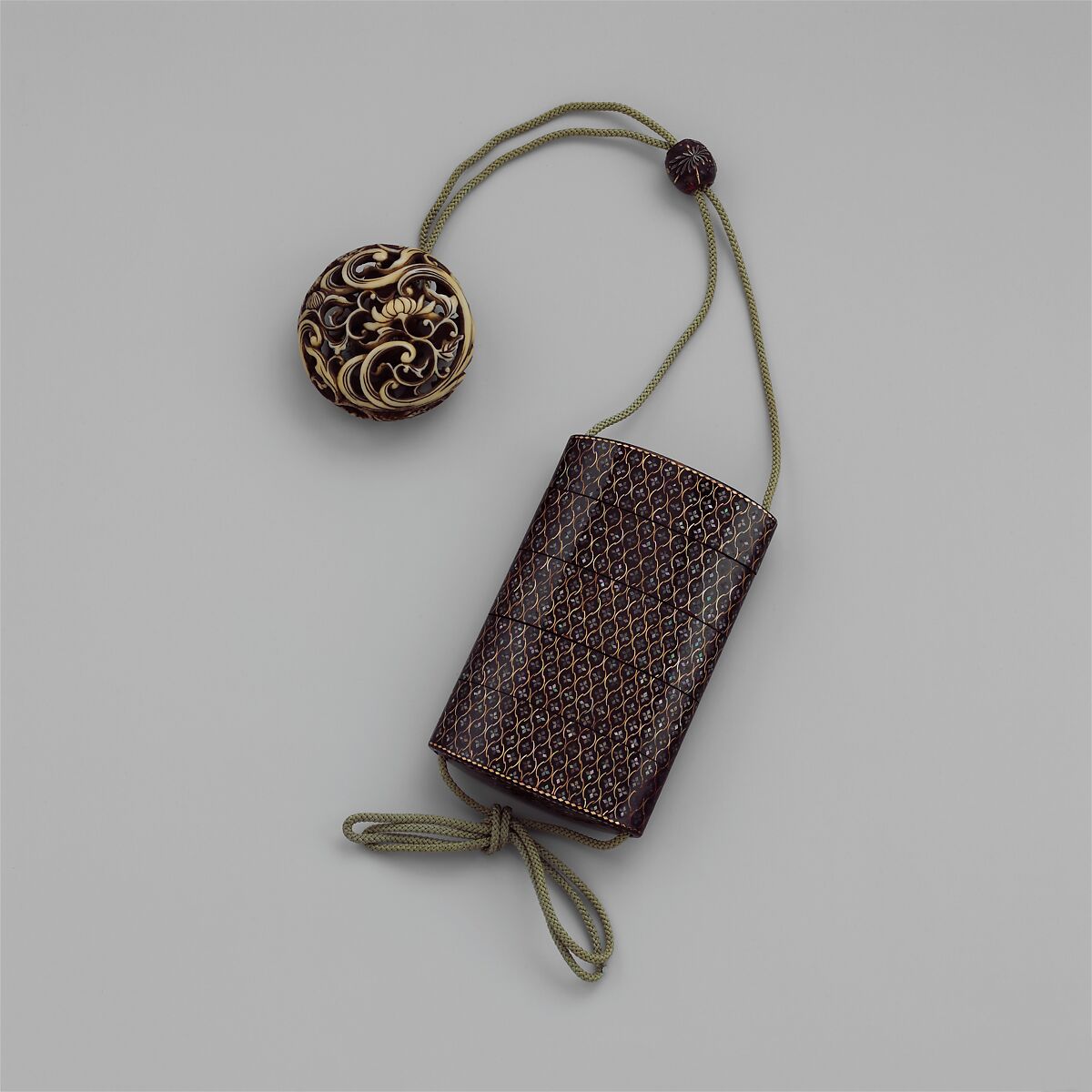 Although the pearl-shell motifs scattered over the surface of this inro appear floral, the lattice-like structure also identifies the design as an abstract representation of nets. Such a repetitive pattern over the entire surface may reflect the use of stencils to decorate Japanese textiles with small, repetitive patterns by the resist-dye technique, a tradition that flourished in the late eighteenth and nineteenth centuries.