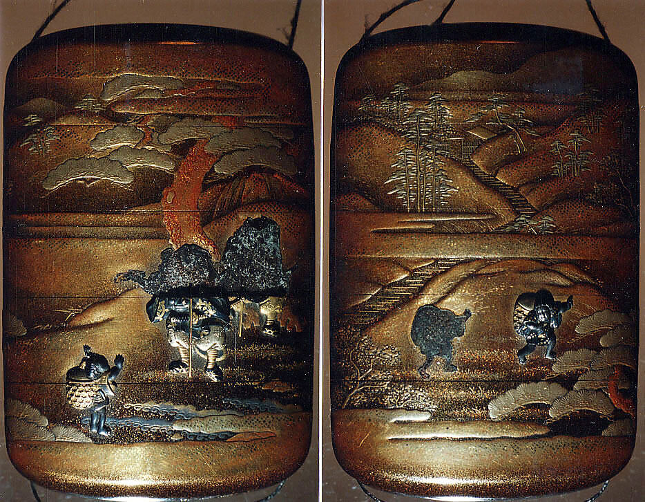 - Title: Case (Inrō) with Design of People (Benkei and Yoshitsune)Talking to Child Carrying a Large Basket (obverse); Two Running Children (reverse)