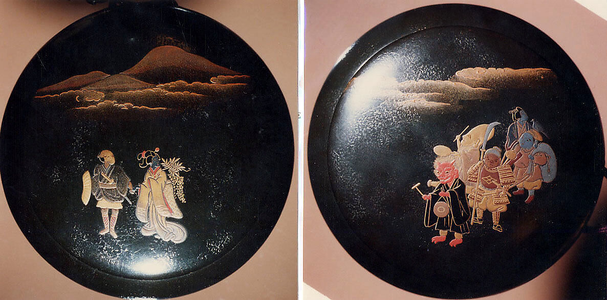 - Medium: Lacquer, dark ishime ground, gold, silver, black and red hiramakie, togidashi; Interior: roiro and nashiji
