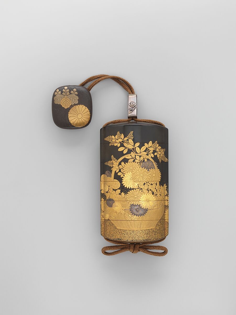 - Medium:Five cases; lacquered wood with gold and silver hiramaki-e, togidashimaki-e, cutout gold foil application on black and nashiji lacquer groundNetsuke: lacquered wood with hiramaki-e; chrysanthemum and paulownia flowerOjime: silver bead inlaid with gold