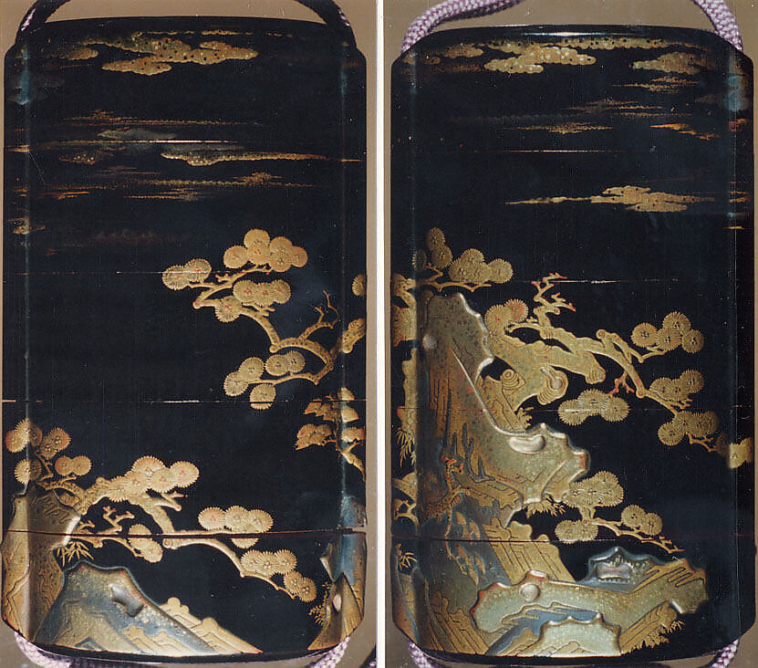 - Title:Case (Inrō) with Design of Pine Trees Growing from Rocks beneath Clouds