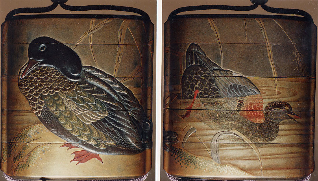 - Title:Case (Inrō) with Design of Duck Standing on Shore beside Reeds (obverse); Duck Diving into Water (reverse)
