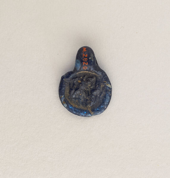 On obverse, circular stamp with lion in relief rearing to right and resting its forelegs on back of a crouching bull with horns and long tail, facing left. The stamp has been applied by mistake to the pendant with the design upside down, facing the loop.