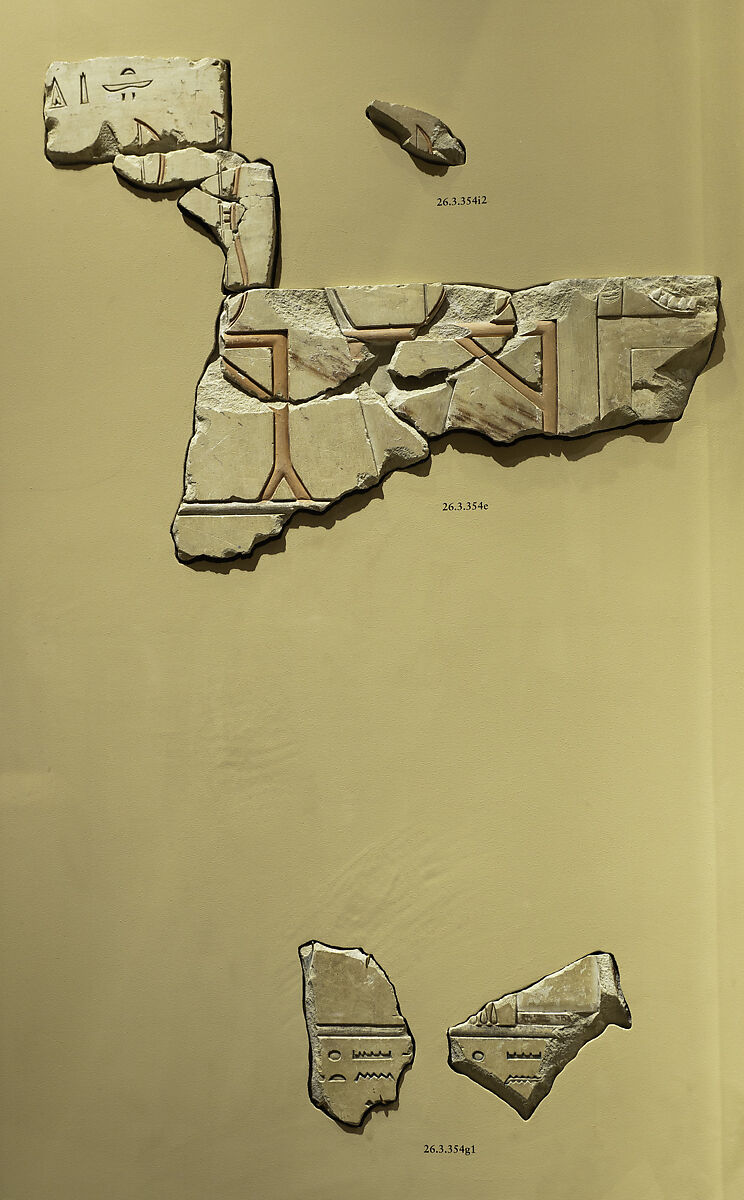 On top of the standards are bows that the artists have rendered as if they were standing upright. This is probably only to show the objects in full view; in reality they would have been laid flat on top of the standards. On the top right is the fragmentary depiction of a box on which a beaded collar is displayed. Again, this collar was in reality most probably inside the box. On the fragments at the bottom (26.3.354g1), the foot of a piece of furniture and some pendants at the end of a necklace are preserved. The word menkhet (clothing) appears twice, indicating what was represented in the register below.