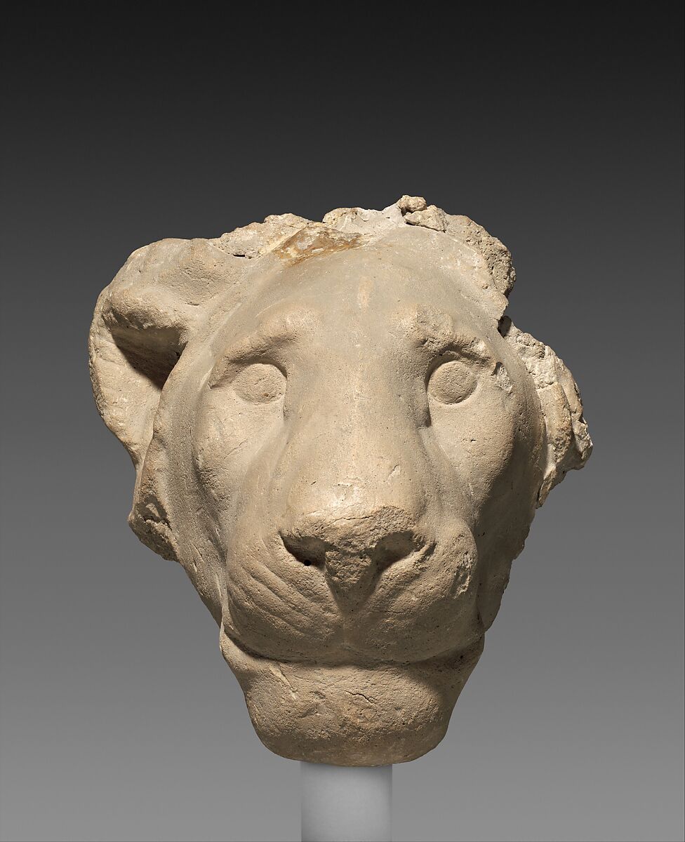 This lion is cast in plaster from a clay model, now lost, and the details then added by hand. Small elements left by the casting process may be observed in the light-colored stripe documenting the removal of the seam created by the molds used in casting and the minor differences between the two halves of the face. The piece is hollow and in back, finger impressions are visible, left by the craftsmen when they added thicker plaster to support the finer material used for the features.