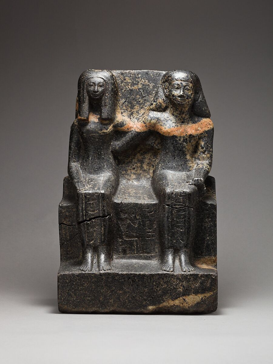 This finely carved pair statue depicts the "House Mistress, Rennefer," and the "Overseer of Craftsmen, Neferkhawet." Rennefer, seated at the left, occupies the dominant position more commonly held by the man. This unusual configuration may reflect the fact that the inscribed dedication was made by the couple's daughter, Ruiu, instead of by a son. The statue is carved from granodiorite, an unusual choice for such statues, which were usually made of limestone or sandstone. The sculptor appears to have taken advantage of a vein of pink feldspar to create the illusion of the broad beaded necklaces, known as broad collars, that were part of the formal costume of funerary statues.