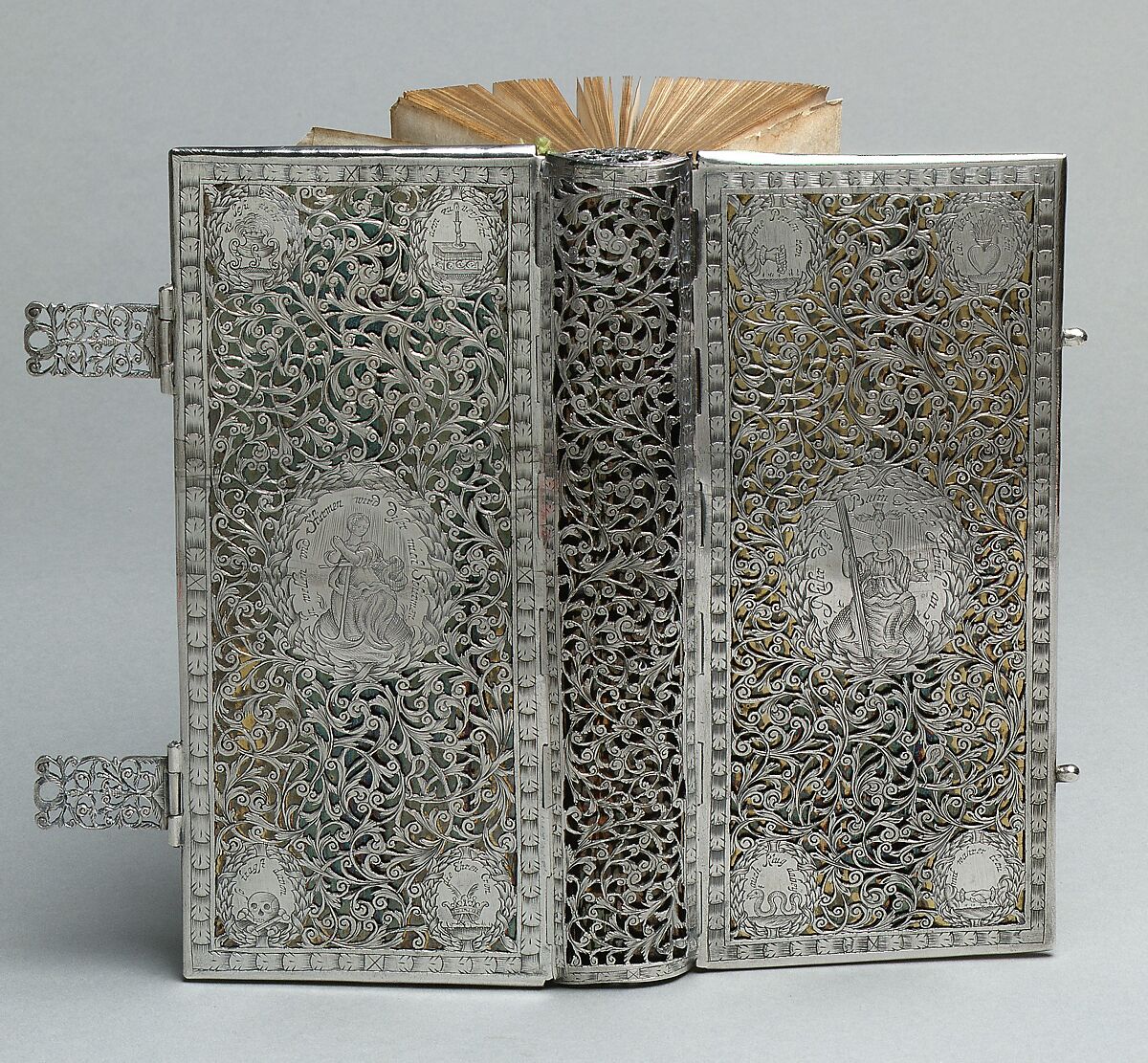 During the seventeenth and eighteenth centuries, silver bookbindings were made to cover the personal copies of small bibles, songbooks and prayerbooks belonging to the upper classes. The manufacture of this type of silver bookbinding took place almost exclusively in Holland, Germany, Switzerland, and Scandinavia. This binding covers one of the most popular German devotional books of the time, the "Paradijs Gartlein" of the Lutheran theologian Johann Arndt, first published in 1612. The binding was possibly engraved by Philipp Holeisen of Augsburg, and the images were probably inspired by contemporary printed engravings. Both covers of this binding have a silver panel peirced and engraved with floral scrollwork enclosing five cartouches on a ground of sheet silver, formerly gilt. The silver spine is pierced and engraved in a similar manner. There are two silver clasps on the foredge, the boards of the book are wooden, and all edges of the textblock are gilt.