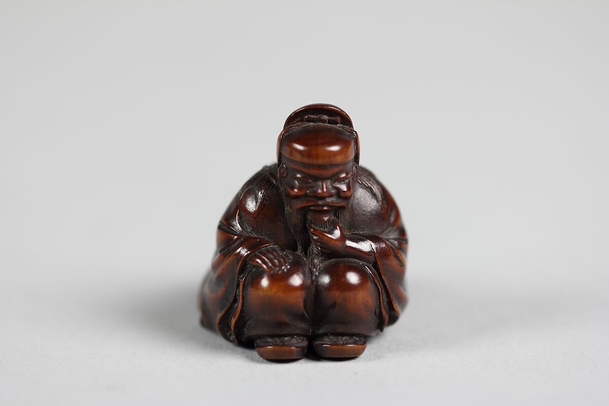 Netsuke of Seated Figure of an Old Man with Backpack Containing a Mask